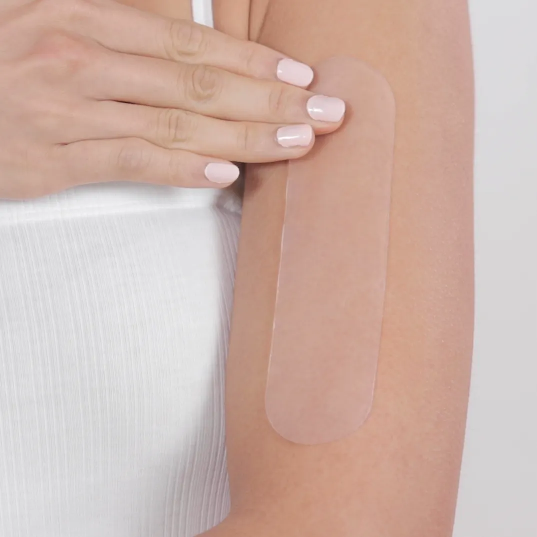 - After cleaning the skin, tear off the protective film, stick the adhesive side to the skin, avoid air bubble and press gently till secured.
